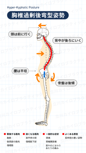 – 過度な後弯: 背中の上部が顕著に丸くなり、猫背の外観になります。