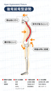 – 膝の屈曲または過伸展: 過度な脊柱カーブのバランスを取るために、膝がわずかに曲がるか、過伸展することがあります。