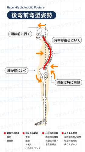 – 複合的な筋肉のアンバランス: 胸部と股関節屈筋の同時緊張と、背筋と腹筋の弱化。
